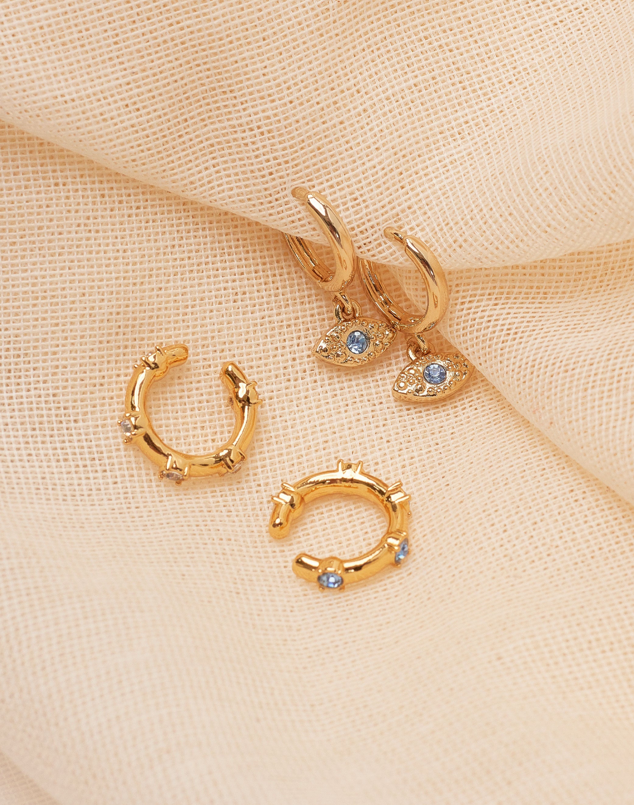 Includes hoop earrings and 2 earcuffs. 24k Gold Plating Sizes: Earcuffs 15 mm x 4 mm; hoop earrings 5 mm x 10 mm Weight: 6.5 g