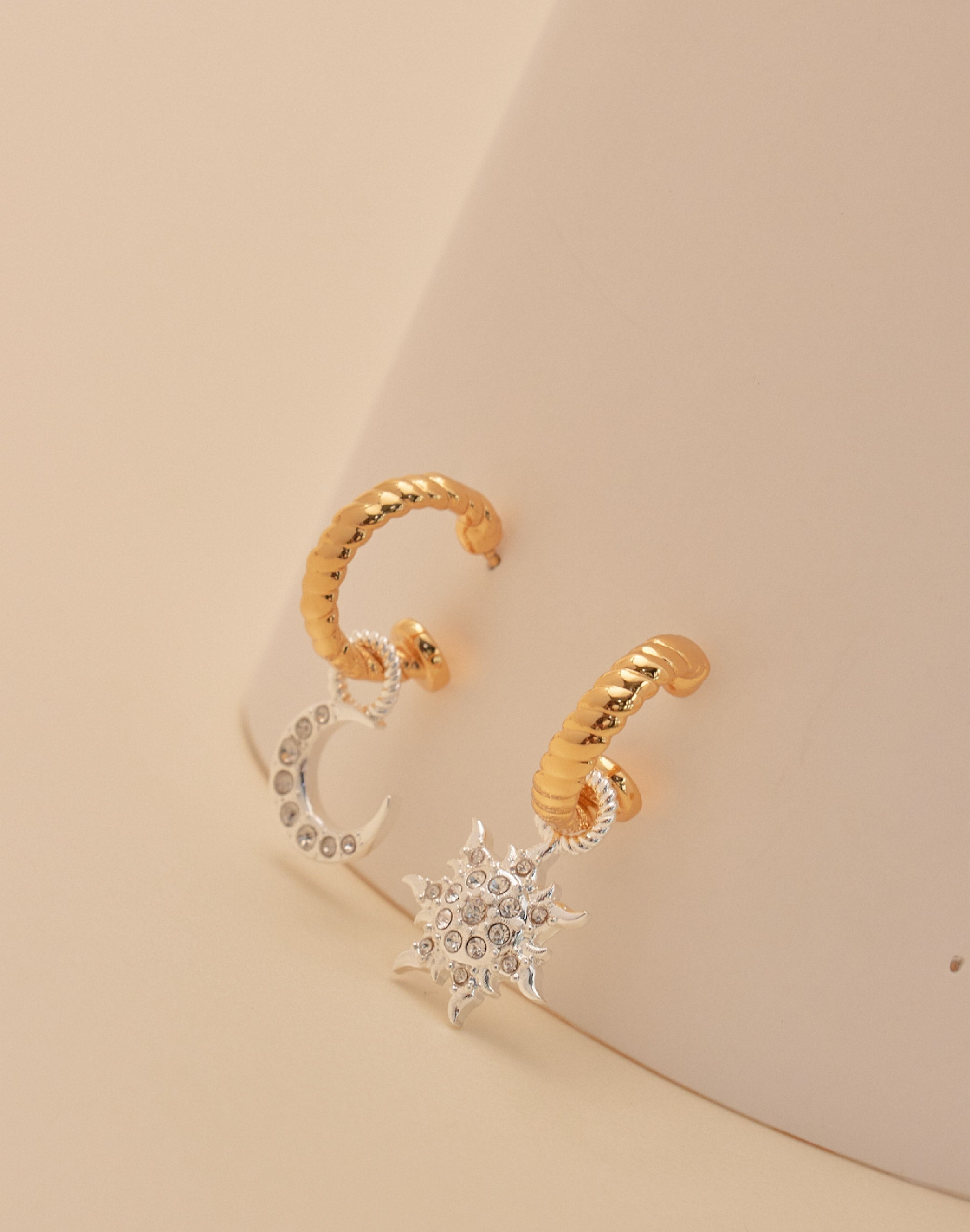 Estas candongas combinan el brillo del oro y la plata para un look único. Cada una lleva un dije removible: una estrella y una luna. Cambia los dijes cuando quieras y dale un toque especial a tu estilo con estas candongas.
