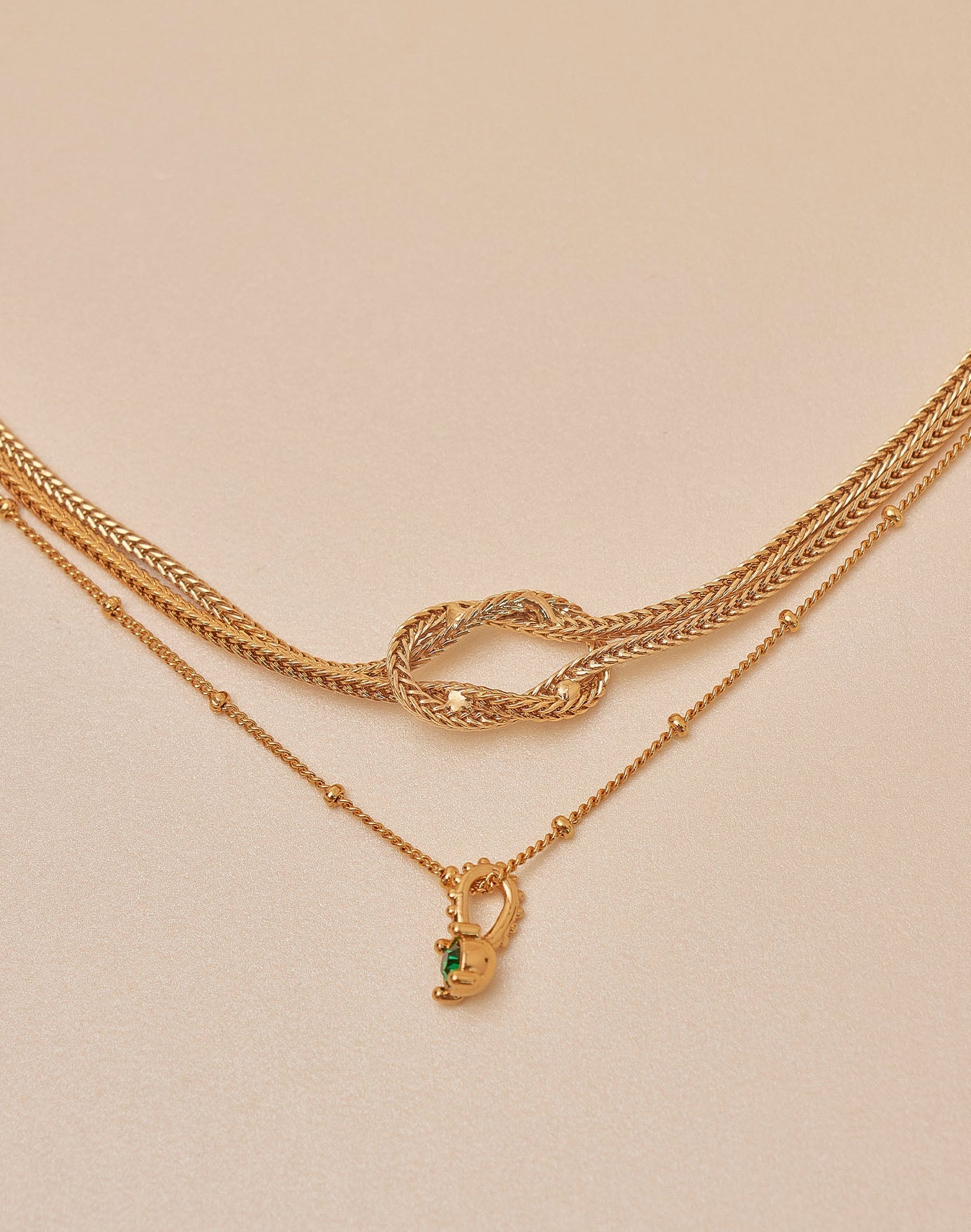 El set Bond reúne dos collares que combinan tendencia y simbolismo: un collar con nudo que representa los lazos que nos unen y otro con cristal emerald que aporta un brillo profundo y sofisticado.