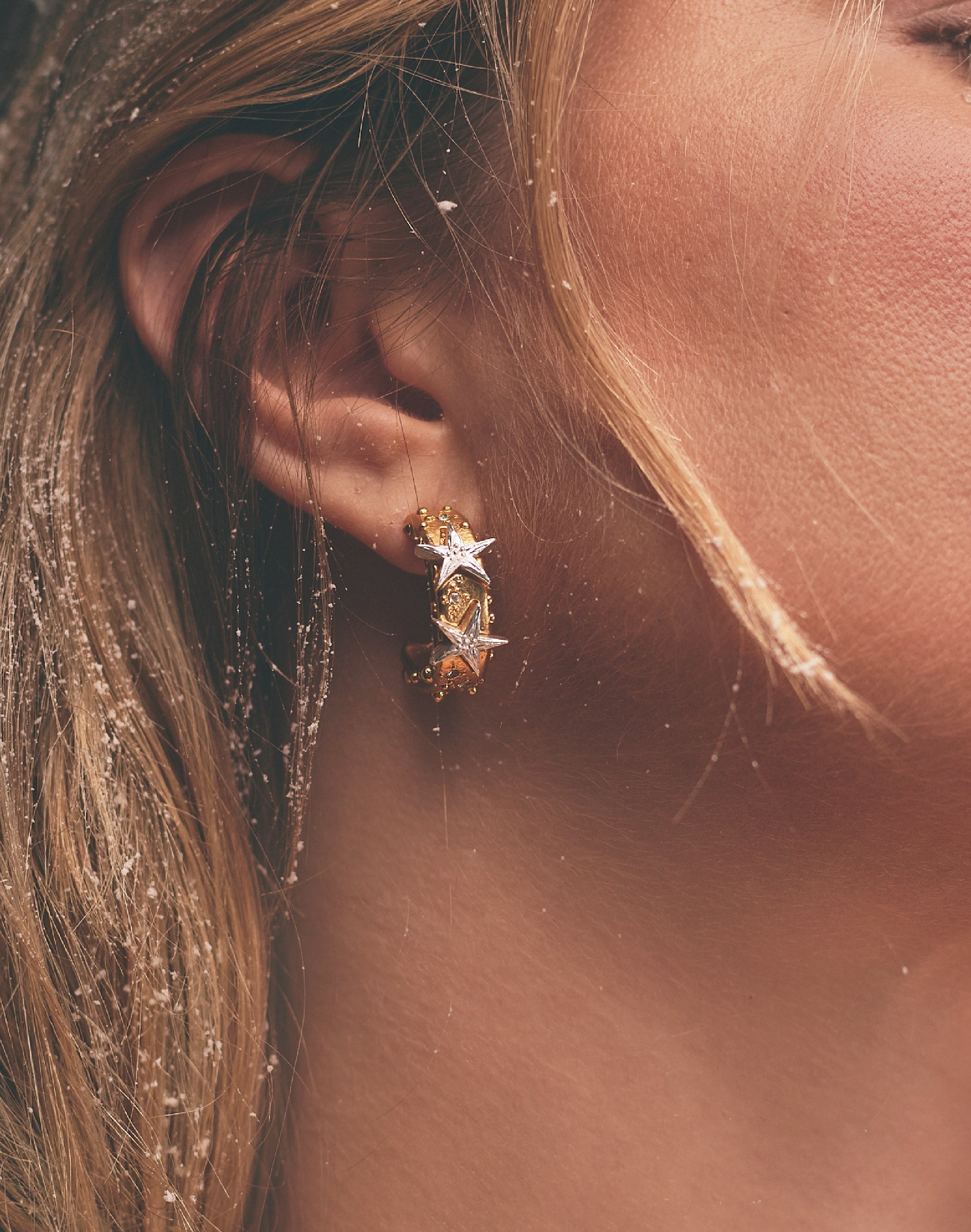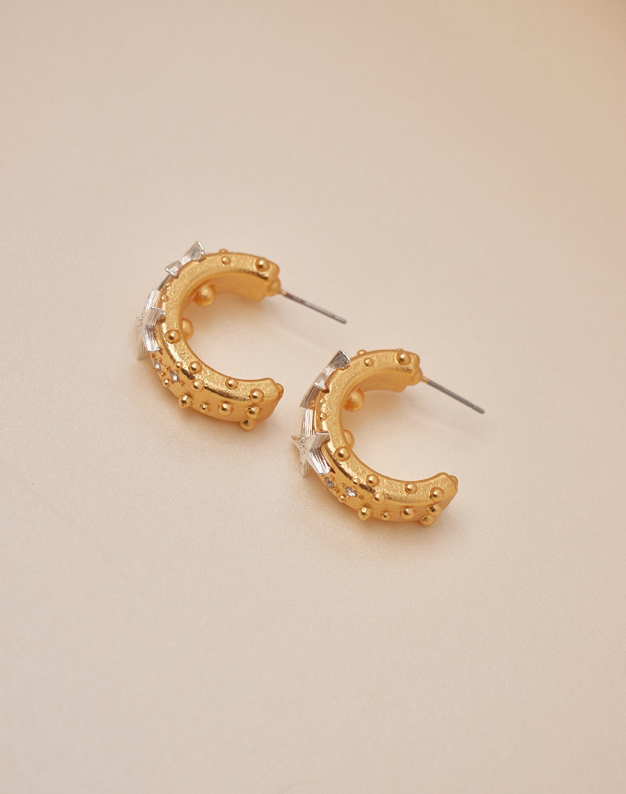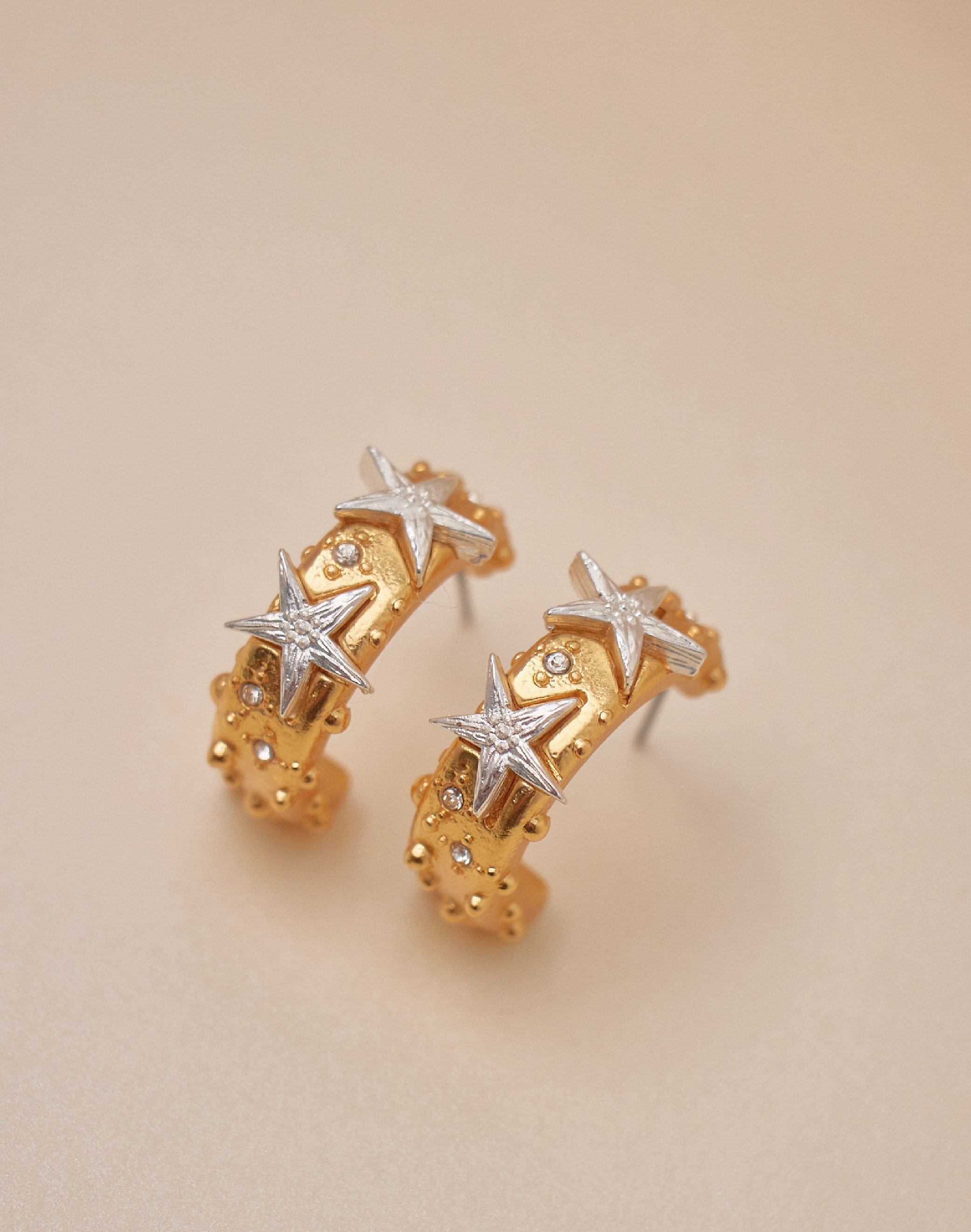 Candongas Polar: donde la elegancia brilla con cada movimiento. Estas candongas en oro con estrellas delicadamente incrustadas en plata, creando un contraste luminoso que hipnotiza. Perfectas para quien busca un accesorio versátil que pasa de día a noche sin esfuerzo.