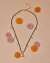 Piedras de murano faceteadas en tono aguamarina acompañan un dije de polilla, emblema de transformación y luz interior. Una pieza delicada con carácter botánico.